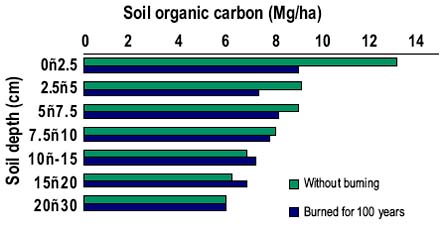 In particular, the practice of burning agricultural fields before cultivation has a disastrous effect on soil organic carbon content. Figure 24 shows the reduction in soil organic carbon in agricultural fields after 100 years of burning crop residues and weeds compared with an area that was not burned or ploughed during the same period. The topsoil layer (0-5 cm) represented the greatest carbon loss (36 percent) compared with the area that was not burned. Soil N stock in the same layer was reduced by 16 percent. The carbon stock was reduced not only through burning, but because of the whole land-use management, especially a drastic reduction in diversity of species as monocropping was practised (Amado et al., 2005).