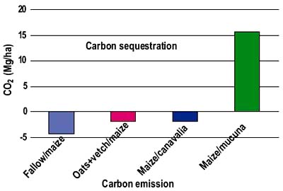 Figure 25 illustrates the fact that some cropping systems can act as a sink for CO2. In this example, the carbon stock in soils under natural vegetation is used as a reference (steady state: DC = 0). In eight years, the fallow/maize system liberated 4.3 tonnes of CO2 per hectare. The maize/mucuna system showed a positive balance of almost 20 tonnes of CO2 per hectare compared with fallow/maize. Compared with soils under natural vegetation, this means a capture of atmospheric CO2 of more than 15 tonnes/ha in eight years. Lovato (2001) found an increase of 2 tonnes/ha/year over 13 years in a rotation system of oats - common vetch/maiz - cowpea. These figures confirm the potential of conservation agriculture for carbon sequestration. However, the simple change from soil tillage to zero tillage is not enough. According to Lovato et al. (2004), a minimum addition of 4.2 tonnes/ha/year of carbon in vegetative residues in cropping systems and 4.5 tonnes/ha/year in mixed systems of pastures and crops (Nicoloso, Lovato and Lanzanova, 2005) is necessary for maintaining soil organic matter at stable levels. This means that below these values CO2 emission will or can take place and, thus, that for conservation agriculture systems to become successful in promoting carbon sequestration, it is necessary to include crops and pastures in the rotation that add large quantities of biomass.