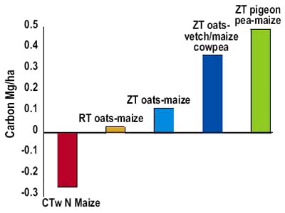Even more C can be stored by adding leguminous cover crops to the rotation cycle. This is shown in Figure 26, based on two long-term experiments in Rio Grande do Sul, Brazil. Besides addition of C to the soil, legumes add a substantial quantity of N to the soil, which results in increased biomass production of succeeding crops.