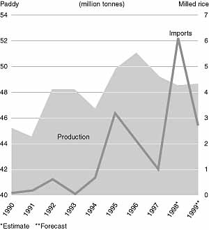 In Indonesia, the El Niño weather phenomenon affected most parts of the country, including the island of Java, where most of the rice is grown. Over 400 000 ha of the 1997 second-season crop was reportedly damaged by heat and drought, resulting in a 3 percent fall in the country's 1997 paddy production to about 49 million tonnes. The lingering drought also delayed the planting of Indonesia's 1998 main-season crop (by up to ten weeks in some places) owing to lack of moisture in many of the traditional rainfed rice areas which, together with lower planted area, brought about a further 2 percent decline in the country's 1998 paddy output.