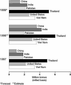 On the export side, a number of countries were able to increase shipments to help satisfy the rise in international import demand. This was made possible by the bumper crops harvested in several of the major exporting countries in 1997. Exports from Thailand in 1998 are estimated at 6.4 million tonnes, up by over