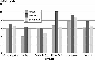 Using Magat and Mestizo hybrids, large-scale technology demonstration trials (5 to 20 ha) were set up by PhilRice and the Department of Agriculture during the 1998 dry season in five of the 11 provinces targeted for hybrid rice cultivation. In these trials, the Mestizo hybrid yielded up to 10.2 tonnes/ha (with a mean of 7.45 tonnes/ha) - more than the best inbred varieties used as checks which, on average, yielded up to