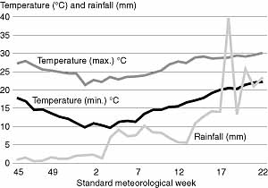 The cultivation of traditional varieties in the rainfed swampy situation is mainly owing to the favourable seedling height attained by these varieties. From the time of sowing through the early vegetative phase, the temperature situation is not ideal for the growth of boro rice (see Figure). Low temperatures cause slow seedling growth in susceptible varieties. In irrigated ecologies, where farmers have good control over the water supply, the shorter seedling height of improved varieties does not encourage the use of traditional varieties, resulting in the predominance of improved varieties in irrigated ecologies.