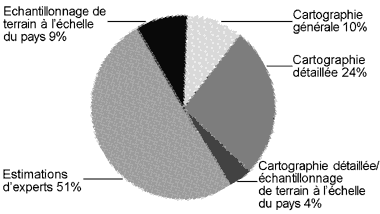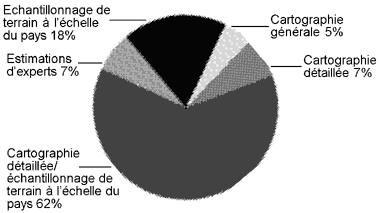 Les pays au couvert forestier le plus faible tendent à déployer moins d'efforts pour produire des informations forestières fondées sur l'échantillonnage de terrain ou la télédétection. Les informations de base pour l'ERF 2000 montraient que, sur 156 pays, 94 (61 pour cent) n'ont pas mené d'enquêtes sur les ressources forestières et utilisent des informations générées par des estimations d'experts ou par la cartographie générale. Ces pays représentent 47 pour cent du total des terres émergées, mais 25 pour cent seulement de la superficie forestière (figure 2). Des inventaires nationaux basés sur l'échantillonnage de terrain ont été dressés dans 20 pays (13 pour cent de la superficie forestière); sur ceux-ci, trois seulement (2 pour cent de la superficie forestière) ont refait leurs inventaires forestiers. Par ailleurs, 48 pays (31 pour cent de la superficie forestière) se sont basés sur des cartes détaillées pour produire des informations sur l'étendue du couvert forestier.