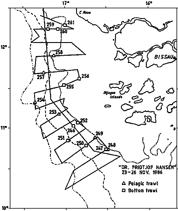 Figure 1. Course tracks and fishing stations Guinea Bissau, 23-26 November 1986.