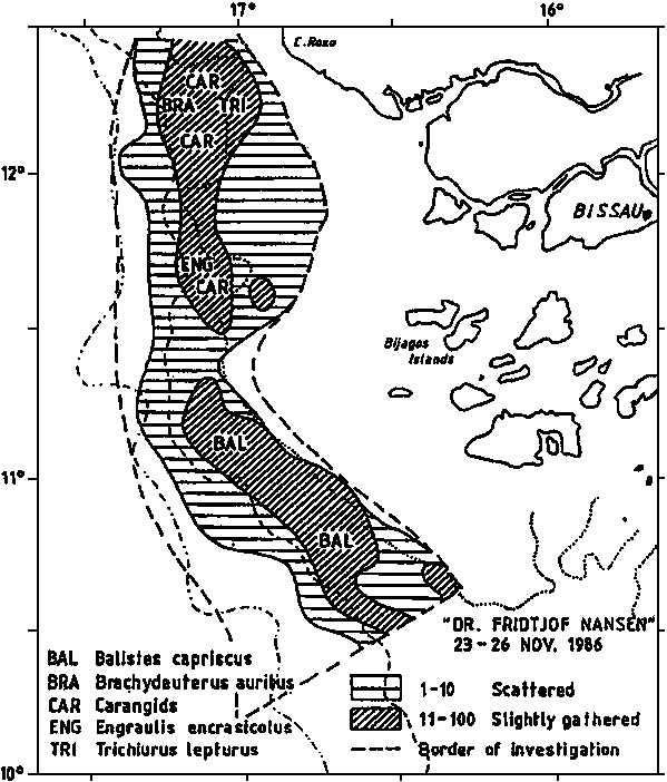 Figure 4 shows the fish distribution from the acoustic observations. No dense concentrations of fish were located in this area. As previously triggerfish was found over the middle part of the shelf up to the Bijagos Islands. One catch of 8 tons pr hour of this species was made, but otherwise catches were low both in the bottom - and mid water trawls. Northwards towards Cape Roxo the relatively small catches consisted of some carangids together with Brachydeuterus, barracudas, hairtails, sharks a.o. Biomass estimates for this area will be presented later.