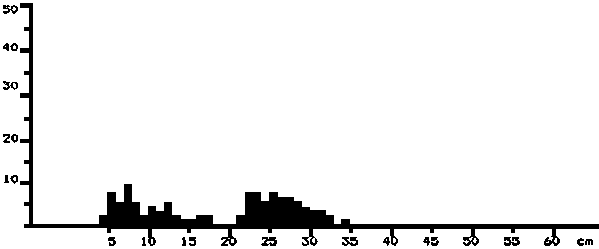 Figure 9 presents the size distributions of samples of the main species from the Mauritanian shelf. The sardinellas and the false scad were represented by medium and large fish, the horse mackerel by a wide range of sizes from 5 to 35 cm, while the sardine had a narrow size range between 20 and 25 cm.