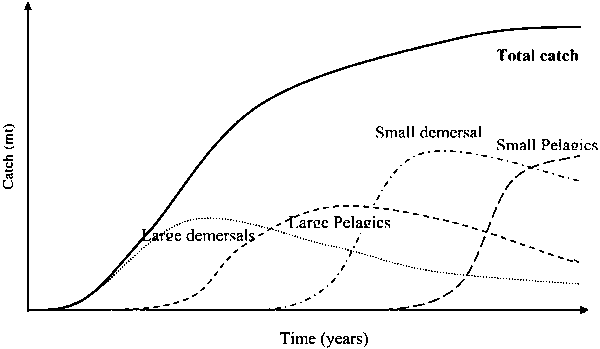 This approach is based on a hypothetical fishery in which industrial-scale fishing (mainly bottom trawling, purse seining and long-lining) expanded in the 1950s and 1960s. The catches in the earlier stages of this development were dominated by large longer-lived predators. As these became fished down, fishers expanded their efforts moving further away from their home base and starting to take smaller, less predatory fish. During this period, total production from the fishery can be expected to be maintained, masking the serial depletion that is occurring. Most alarming is that throughout this period, the total amount of fish in the ocean is continually declining and the catch rates of the major groups are also declining as they, in turn, become overexploited.