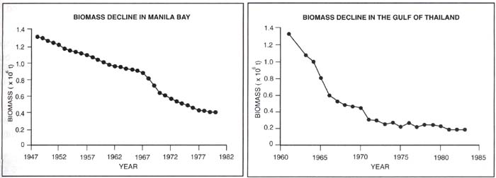 Overall, analyses of the trawl surveys showed substantive degradation and overfishing of coastal stocks. For trawl surveys where there were more than 25 years between surveys, the amount of fish (measured as tonnes/km2) had declined to between 6 and 33 percent of the original value. In all cases, the amount of fish had declined, some as much as 40 percent in 5 years. The most dramatic declines were in the Gulf of Thailand and the East coast of Malaysia. Two examples, one for the Gulf of Thailand and one for Manila Bay are given in Figure 27.