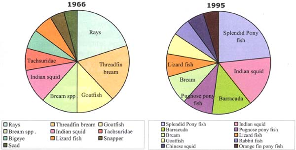 The massive decline in the amount of fisheries resources available for today's fishers has also been associated with changes in the composition of the catch. Surveys in the Gulf of Thailand and in the Lingayen Gulf in the Philippines have shown that the abundance of larger, more valuable species (e.g. groupers, snappers, sharks and rays) higher up in the food chain have declined, while smaller species lower in the food chain (e.g. triggerfish, cardinal fish and squids/octopus) have increased to relative abundance. In the Gulf of Thailand trawl survey catch in the 1960s, the top 10 species (or species groups) were made up of rays, bream, goatfish with some squid, lizard fish and snapper (Figure 28). By contrast in the mid-1990s, less desirable pony fish, squid, barracuda, and lizard fish had become much more prevalent.