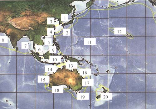 1. Sea of Japan; 2. Kuroshiro Current; 3. Yellow Sea; 4. East China Sea; 5. South China Sea; 6. Bay of Bengal; 7. Gulf of Thailand; 8. Arabian Sea; 9. Sulu-Celebes Seas; 10. Indonesian Sea; 11. Western-Central Pacific; 12. Pacific Hawaiian; 13. N Australia; 14. NW Australia; 15. W Australia; 16. NE Australia; 17. E Australia; 18. SW Australia; 19. SE Australia; and 20. New Zealand