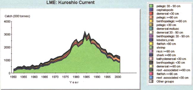 The Kuroshio Current LME is considered a moderately high (150-300 gC/m2/yr) productivity ecosystem with coastal areas that are highly productive. Japan and China are the major fishing nations in the region. The fish catch includes Japanese sardine, Pacific saury, anchovy, jack mackerel, horse mackerel, frigate mackerel, yellowtail, filefish, herring, sea robin, and parrot bass (Figure 30). The sardine population, which is characteristic of small pelagic fish populations, has shown marked fluctuations, attaining an all time maximum in the 1930s, then showing a decrease from 1964 to 1971. It has since increased. With the fluctuations there have been accompanying geographic shifts of spawning and nursery grounds. As is the case in the Sea of Japan, the system has always been dominated by small to mid-sized pelagics, with a more recent trend to large pelagics.