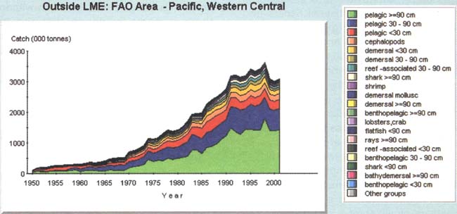 The current status of fisheries in the South Pacific was recently reviewed by APFIC[25]. The fisheries catch was divided into oceanic resources that include tunas, billfish that live in the open-water pelagic habitat and coastal fisheries. The offshore resources form the basis of the regions industrialized fisheries and have been fished by an international fleet from 26 different nations over the past 25 years - 15 Pacific Island States and 11 distant-water fishing nations with the bulk of the catch being taken by Japan, USA, Korea RO, and China PR. About 1.6 million tonnes of tuna, as well as an unknown amount of by-catch have been taken from the Western and Central Pacific each year during the 1990s. The main species are skipjack (the majority of which is taken by purse seiners), yellowfin and bigeye tuna (an increasing catch associated with drifting fish attracting devices), and albacore (caught by long-line and trolling with a significant part taken by Pacific Island States) (Figure 31).