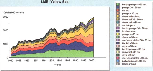 The Yellow Sea LME is a semi-enclosed body of water bounded by the Chinese mainland to the west, the Korean Peninsula to the east, and a line running from the north bank of the mouth of the Yangtze River (Chang Jiang) to the south side of Cheju Island. It covers an area of about 400 000 km2 and measures about 1 000 km by 700 km. It is shallow with a mean depth of 44 meters, and it slopes gently from the Chinese continent. The Yellow Sea LME is classified as highly productive (>300 gC/m2/yr) ecosystem. It has marked seasonal variations and supports substantial populations of fish, invertebrates, marine mammals, and seabirds. It has both cold temperate species (eel-pout, cod, flatfish, Pacific herring) and warm water species (skates, gurnard, jewfish, small yellow croaker, spotted sardine, fleshy shrimp, southern rough shrimp) (Figure 32).