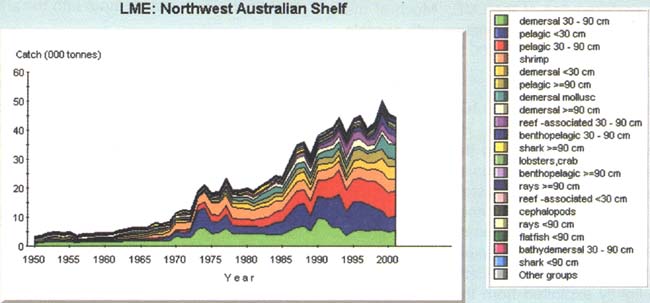 In the Northwest Australia LME, fish stocks are quite small and the level of endemicity is low, with most species distributed widely in the Indo-West Pacific region. Reef fisheries occur in the Rowley Shoals, a chain of coral atolls at the edge of the LME's wide continental shelf. Demersal species that are fished here include snapper, beam, emperors and lizard fish (Figure 34). These have historically been fished by foreign fleets that caused widespread habitat destruction with an associated decline in the demersal fish catch and a switch to smaller, less valuable fish. A large part of the area is now closed to pair trawlers and access to foreign fleets has been withdrawn, and there is some evidence that the habitat is recovering. A small domestic trap fishery for demersal fish exists in areas subjected to little trawling. It is thought that there will be an expansion of trap fishing in the two closed areas after the species composition changes induced by trawling are reversed.