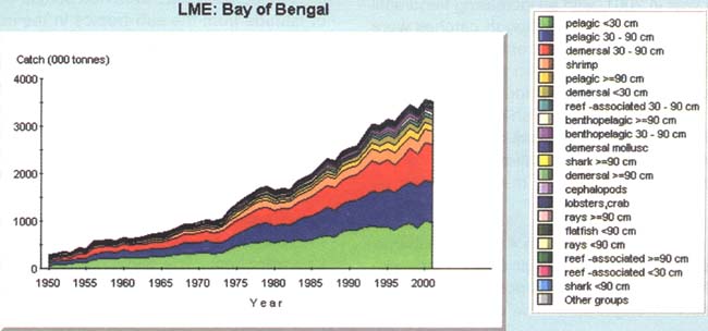 Commercial species include anchovies, croakers, shrimp and tuna (yellowfin, big eye and skipjack). Shrimp is a major export earner. FAO data show a steady rise in total landings in all major groups since the 1950s (Figure 35). Heavy fishing is a comparatively recent phenomenon, so that stocks have not been subjected to fishing pressure over a lengthy period of time but there is now increased competition and conflicts between small-scale and large-scale fishers. There is an alarming increase in cyanide fishing in this LME's coral reefs for the lucrative live food fish markets in Hong Kong and Singapore. Mangroves and estuaries - critical fish spawning and nursery areas - are also under stress or threatened by pollution, sedimentation, dams for flood control (as in Bangladesh), and intensive coastal aquaculture. States bordering the Bay of Bengal rate overexploitation of marine resources as the number one problem in the area.