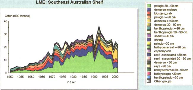 Some of the species harvested are scallops (in Bass Strait), rock lobster (Tasmania), and abalone (Tasmania and Victoria) and finfish in the Southeast trawl fishery. The long-standing trawl fishery has seen serial depletion of several of its important fish stocks, including eastern gemfish and more recently the deepwater orange roughy that is found associated with sea mounts (Figure 37). The fishery has been managed under individual transferable catch quotas (ITQ) since the early 1990s, but to date, these do not appear to have been very effective in reducing overfishing in this multi-species fishery.