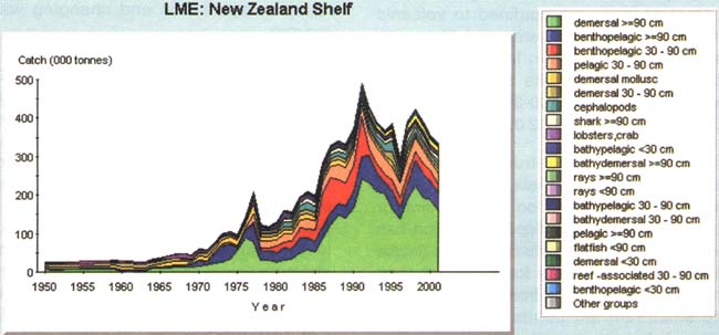 Maori cultural ties with fisheries are strong and their fishing rights are recognized in law. Fishing is a popular leisure activity for as many as one in five New Zealanders. Among the important commercial fisheries of the area are those for migratory predators such as tuna, billfish, and sharks. There is also a bottom fishery for the orange roughy, an important blue grenadier fishery and a coastal fishery for a variety of crustaceans and mollusks (Figure 38). The fishing industry is mostly export-oriented. All fisheries are managed under an ITQ system, that the NZ government claims has resulted in sustainable fisheries. Prior to the introduction of the system, overfishing of coastal resources had occurred. There are conflicting reports on the extent to which these have recovered, although there is evidence that certain groups, such as lobsters are responding to the new management regimes. As in Australia, the long-lived deepwater species such as orange roughy have continued to decline, offset by the discovery of new stocks and expansion in fishing. Other important stocks, such as the blue grenadier appear to be fished sustainably at present.