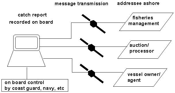 Having entered catch data into a shipboard computer as part of daily routine, the ships captain would then be capable, by selecting various subsets of the raw data that had been entered, to send advance reports of produce that will be for sale to the auction at which he intends to land; to a fish processor or agent to offer produce for sale or to confirm landing; or to the owner of his vessel. In addition to this functionality, the catch data would be available for transmission to the fisheries manager in a standard, catch report format and would remain available for on board interrogation in the case of a boarding or landing control by the relevant inspection authority.