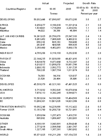 World sugar consumption under the baseline assumptions about income and population growth, is projected to expand by nearly 27 million tonnes between 1993-95 and 2005, to reach 137 million tonnes. The implied annual growth rate, 2 percent would thus approximate that achieved over the 1980s. The bulk of the increase in consumption, over 22 million of the 27 million tonne total, would be in the developing countries, raising further their share of global sugar consumption, to 65.4 percent by the year 2005. Among developing regions, particularly notable growth, of 3 percent annually, is projected for Africa and the Far East, followed by the Near East (2.8 percent p.a.), Oceania (2.3 percent p.a.) and Latin America and the Caribbean (1.9 percent p.a.). Unlike in the 1980s, however, developed countries as a whole, are projected to increase their total sugar consumption between 1993-95 and 2005, albeit by only one-third of the annual growth rate projected for developing countries' consumption. The fastest growth in total consumption in the developed regions would be in North America (1.2 percent p.a.) while the slowest growth rate is projected for the economies in transition (0.5 percent p.a.).