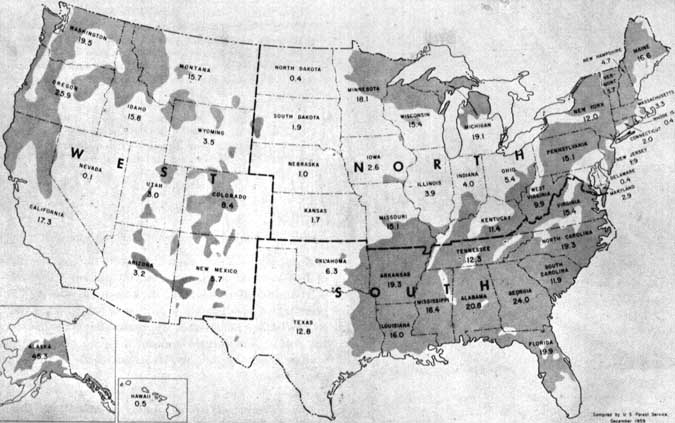 Comme le montre la figure 1, la plupart des forêts productives sont dans les Etats côtiers, quoique chacun des 50 Etats de l'Union ait au moins de petites surfaces de forêts productives. Un cinquième de ces forêts se trouve dans les quatre Etats de la côte pacifique, Alaska, Washington, Orégon et Californie. Le douglas (Pseudotsuga menziesii), Pinus ponderosa ainsi que plusieurs épicéas (Picea sp.) et Tsuga sont les éléments constitutifs les plus valables des forêts de ces Etats. Un autre cinquième de forêts productives se trouve dans les cinq Etats du Sud: Louisiane, Mississippi, Alabama, Georgie et Floride. Plusieurs espèces de pins - loblolly pine (Pinus taeda), longleaf pine (P. palustris), slash pine (P. caribaea), shortleaf pine (P. echinata) et des feuillus mélangés sont les éléments les plus importants des forêts du Sud.
