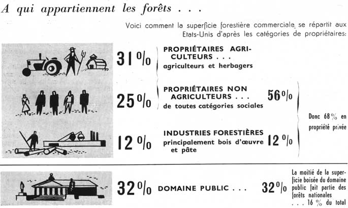 Cinquante-cinq pour cent du volume de bois sur pied et la moitié du volume de bois de sciage sont propriété privée. Dans les Etats de l'Est, environ 90 pour cent du volume de bois se trouvent dans les propriétés privées; dans les Etats de l'Ouest, au contraire, 40 pour cent seulement du volume de bois appartiennent à des particuliers. Plus de 90 pour cent du matériel sur pied existant sur les propriétés collectives de l'Ouest se trouvent dans les forêts nationales ou dans d'autres domaines gérés par le gouvernement fédéral.