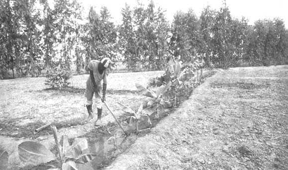 Planting banana trees in Senegal, with a "living fence" in the background (FAO photo by R. Faidutti)
