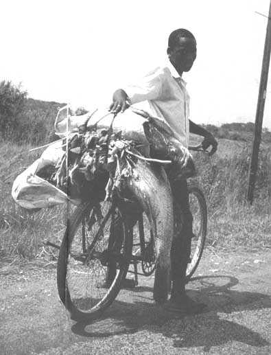 Another major contribution of bicycles is that they make it possible for large numbers of small-scale farmers along the Bombo Road to engage in commercial production. Without the bicycle, small-scale farmers in this region wouldn't be able to pro- duce small volumes of highly perishable commercial crops. Even if a more elaborate road network existed, it would be risky and uneconomical for truckers to purchase small quantities of perishable products and carry them to markets. Cyclists can take these risks because their scale of transport is similar to the scale of production of most small-scale farmers. Truckers requiring tons of produce to get a load are not interested in purchasing 50-75 kg from a small farmer. It isn't difficult to see that small- scale production and small-scale transportation complement each other.