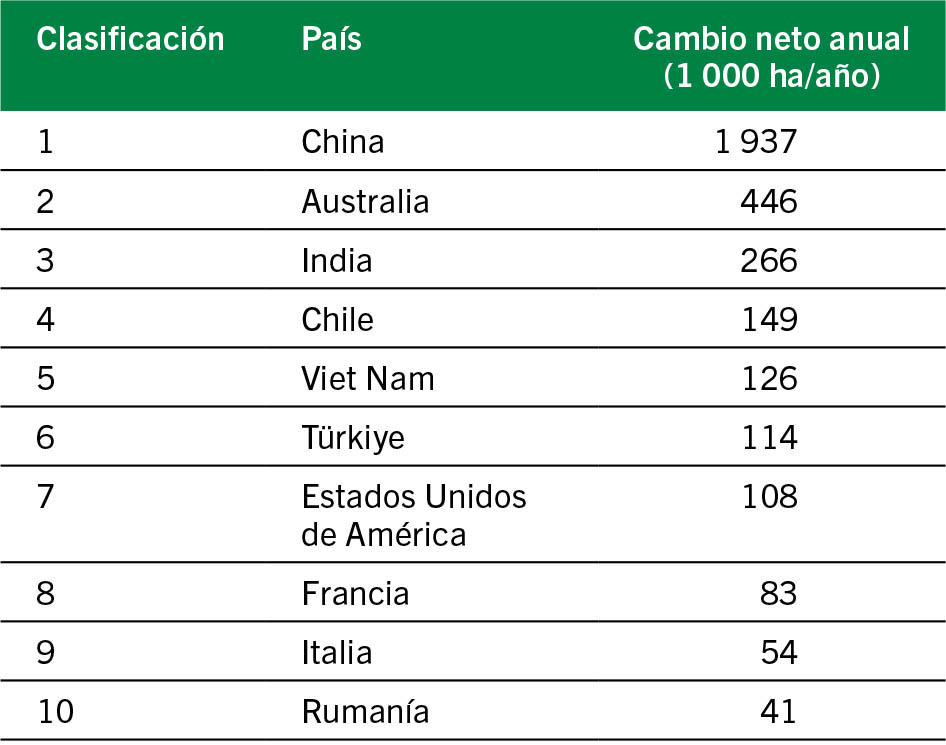 La variación de la superficie forestal a lo largo del tiempo se debe a dos factores: la deforestación y la expansión de los bosques en zonas anteriormente destinadas a otros usos de la tierra. A escala mundial, se estima que la tasa neta de variación de la superficie forestal, que es la diferencia entre la expansión forestal y la deforestación, fue de –4,7 millones de ha al año en el período 2010-2020. Esta cifra fue considerablemente inferior a las registradas en las dos décadas anteriores (–7,8 millones de ha al año en el período 1990-2000 y –5,2 millones de ha al año en el período 2000-2010). En el Cuadro 1 se muestran los 10 principales países del mundo en función de los aumentos netos anuales de la superficie forestal en el decenio hasta 2020.