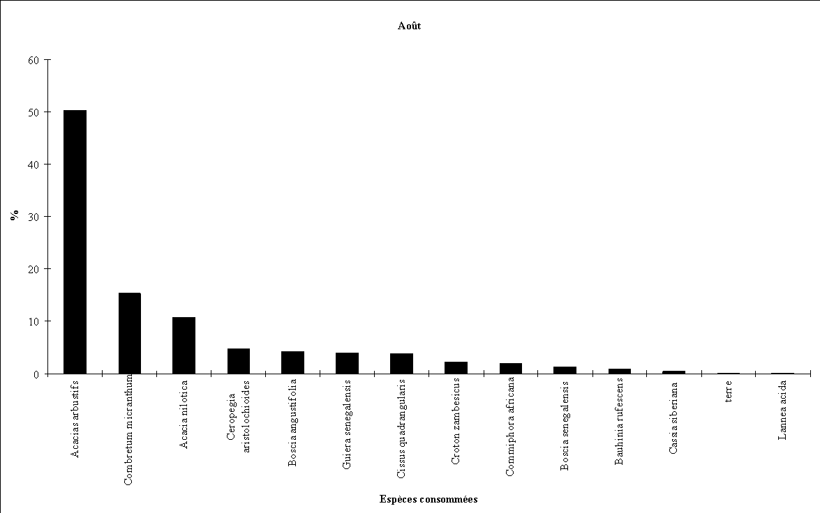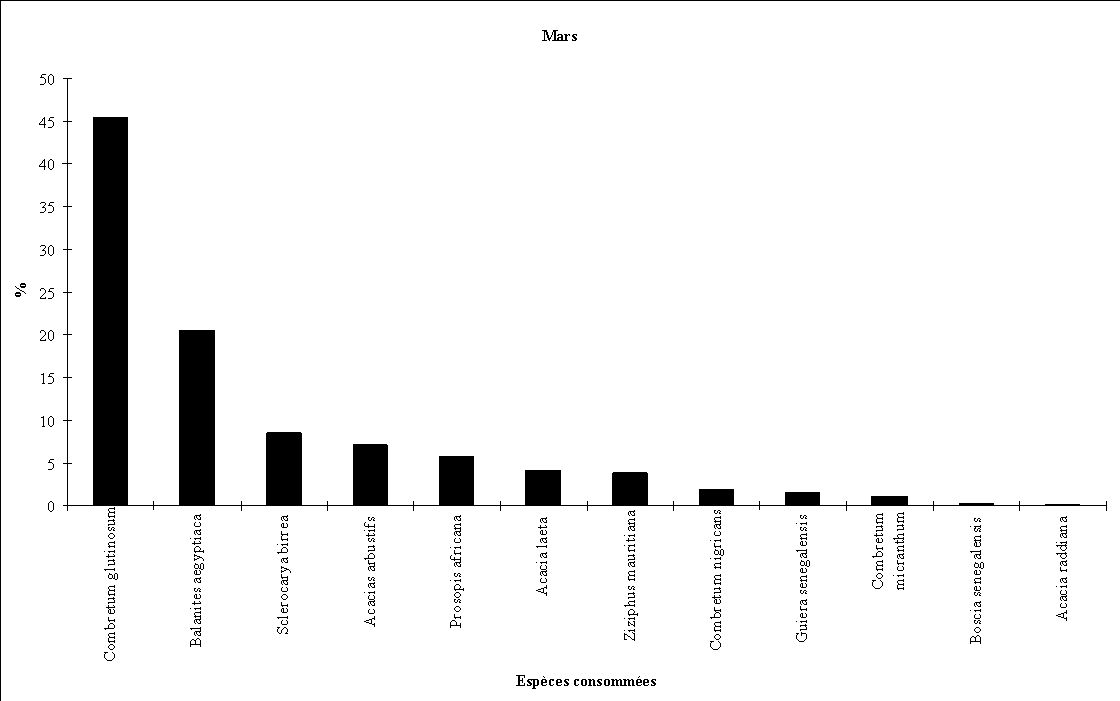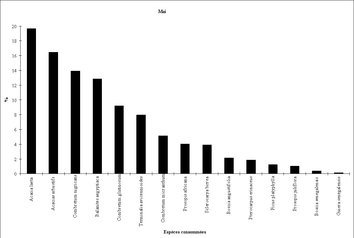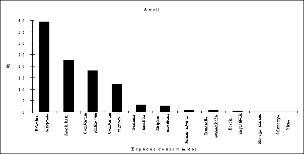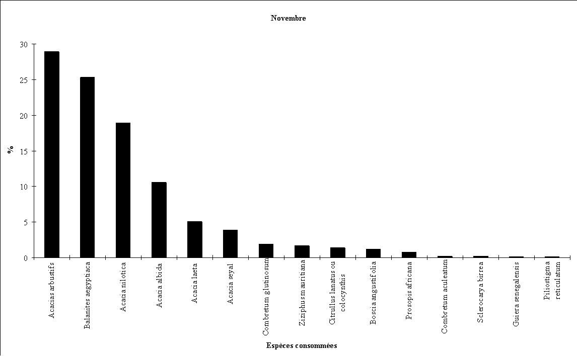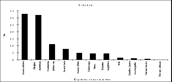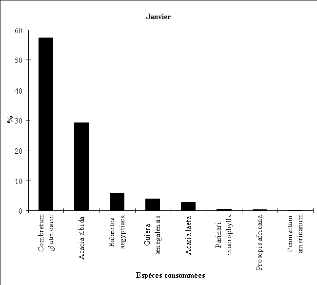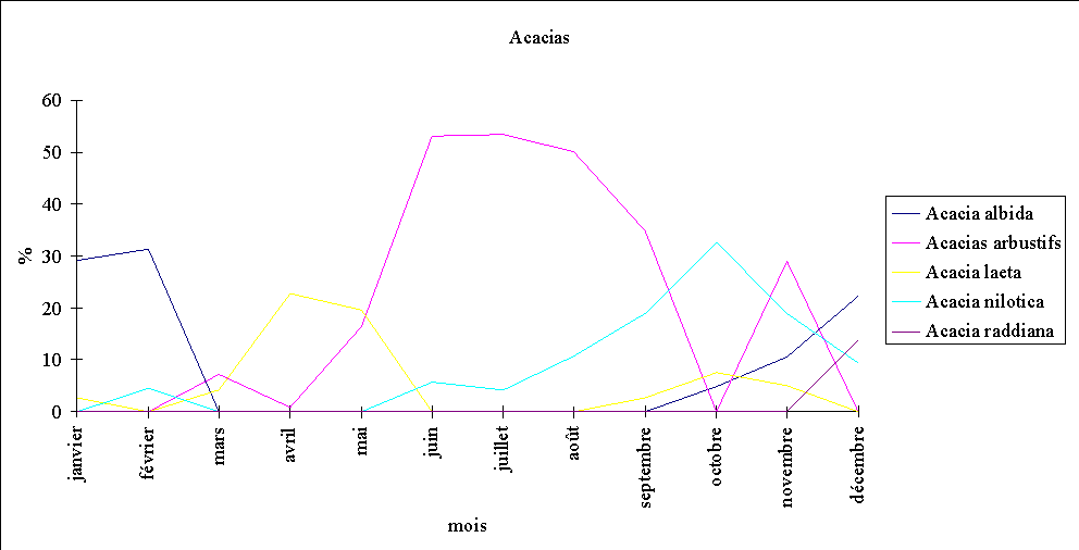 - la consommation d'Acacia albida débute fin octobre (feuillaison), augmente régulièrement en novembre et décembre (floraison) puis en janvier et février (fructification) pour cesser totalement par la suite.