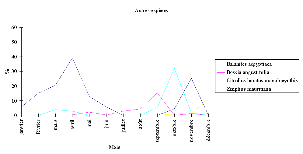 - la consommation de Balanites aegyptiaca augmente régulièrement entre janvier et avril (feuillaison et floraison), décroît en mai et juin et s'annule durant les mois d'hivernage. Elle reprend en octobre, et surtout en novembre, période de maturation des fruits.