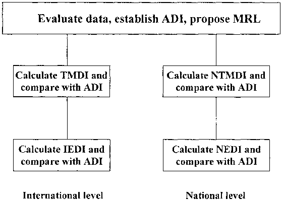 According to those recommendations where TMDI calculations are carried out by the JMPR, they should be based on "cultural" diets rather than the "global" diet, and some changes were proposed in the calculation system. However, the Consultation emphasised that the best use should be made of all available data and recommended that calculations of EMDIs should be discontinued to promote calculations of International Estimated Daily Intake (IEDI) and National Estimated Daily Intake (NEDI). The recommended procedure is illustrated in Figure 6.1.
