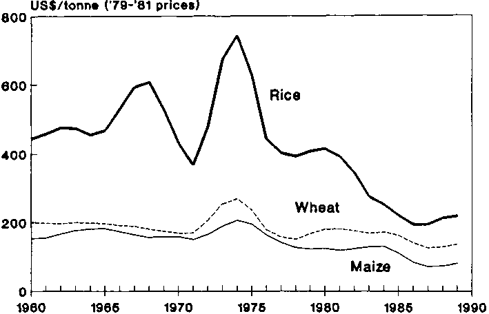 Superficially, the problem of rice availability in Asia would appear to have been solved. Since 1966, when IRRI first released its IR8 variety, world paddy production has nearly doubled from 261 million tonnes (with Asian production at about 240 million tonnes) to 519 million tonnes (Asian production: 479 million tonnes) in 1990. Production has expanded faster than population, which has grown 1.6 times in Asia during the same period by an amount enough to accommodate the increasing per capita demand arising from increasing incomes. In some countries, the income increase is itself to a significant degree a consequence of the increased productivity of their rice farmers. A measure of that success is partly reflected by the fall in the real price of rice in the world markets, which has touched historic lows in the last five years (Figure 1.1). Responding to the low rice prices, the multilateral agencies have been cutting down their lending to finance irrigation. Governments now no longer feel as pressed to support agricultural research as they did.