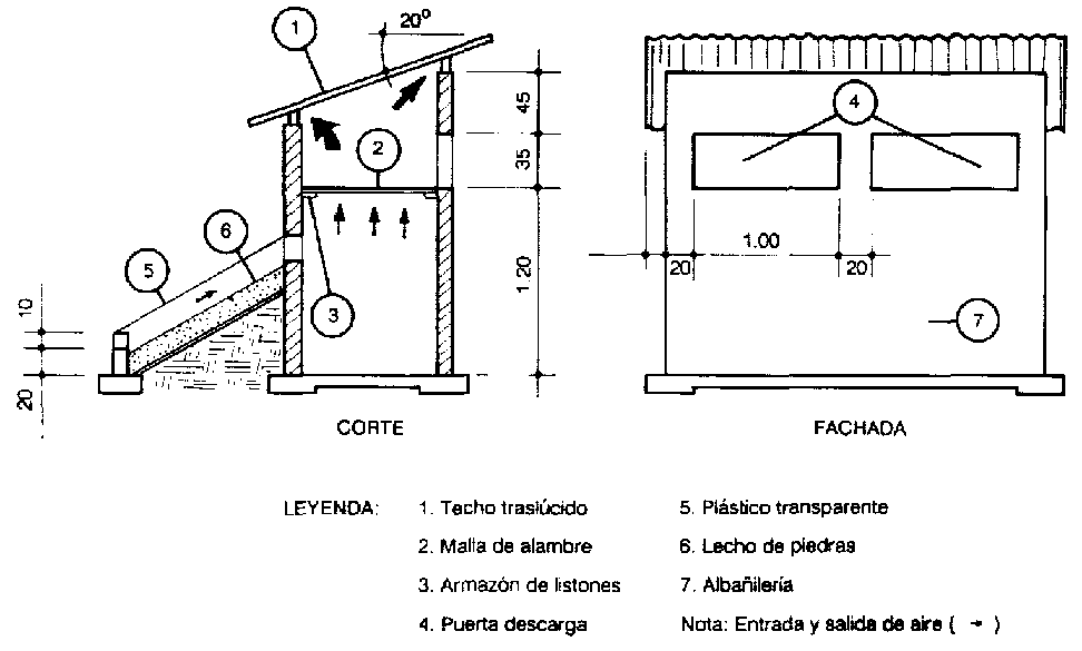 grano para secar; los bordes del piso pueden ser de madera y deben esta' protegidos con plástico hasta una altura de 0,2 m. para evitar la entrada de agua de lluvia. En la parte inferior del lado inclinado y de las paredes laterales se debe dejar una abertura de 0,2 a 0,3 m de altura para facilitar la entrada del aire. Se debe dejar la misma abertura en la parte superior del lado opuesto al lado inclinado, para facilitar la salida del aire. El aire que entra por la base del secador se calienta ahí mismo, lo que aumenta su potencial de secado y provoca su salida' por convección natural, en la parte superior. En el Municipio de Santa Rosa, en el Brasil, que esté a una latitud de 28°, se obtuvo una temperatura media superior en 3° a 5°C a le temperatura ambiente, en invierno, y hasta en 30°C, en primavera. En la misma localidad el tiempo de secado fue de tres a cinco dias asoleados en invierno y de uno a dos días de sol en primavera, con lo cual se logró reducir el grado de humedad de los granos, de 20 a 14%. (PETERSEN, 1984).