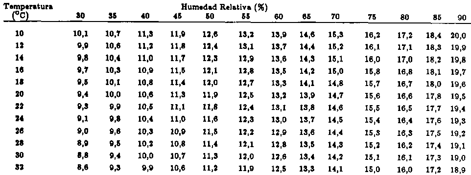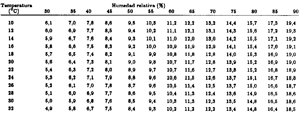 En las tablas presentadas se observa la influencia de la temperatura. Se ve que, con la misma humedad relativa, a medida que aumenta la temperatura disminuye el contengo de humedad de equilibrio. Con la humedad relativa ocurre lo contrario, es decir, que al aumentar la humedad relativa aumenta también el contenido de humedad de equilibrio.