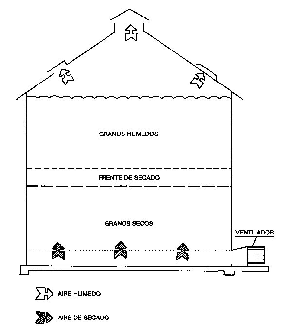 En general, el calentamiento del aire se recomienda solamente en reglones en que el potencial de secado del aire natural es insuficiente para que se alcance el contenido de humedad final que se busca. El calentamiento del aire no aumenta, prácticamente, la velocidad de desplazamiento del frente de secado, e interesara únicamente durante los períodos de alta humedad relativa del aire, ya que no habría detención del desplazamiento del frente de secado.