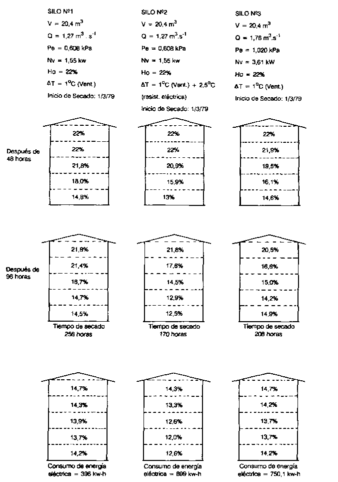 En la Figura 21 se comparan los efectos del aumento de la temperatura del aire y del aumento del movimiento del aire, sobre el secado de maíz, en Viçosa-MG, en 1979. Estos datos se simularon mediante el modelo matemático de Morey (MOREY et al., 1976). El contenido de humedad inicial admitido fue de 22% y el contenido máximo de humedad final fue de 15%. Se escogió este último limite, en lugar del 13%, porque a partir del 15% el riesgo de deterioro del producto es reducido y el ventilador se podría mantener conectado sólo a intervalos, cuando las condiciones climáticas permitieran que se alcance una humedad final del 1396. En 1979 se pudo comprobar que tanto el aumento de la temperatura como el del movimiento del aire determinaron una reducción en el tiempo de secado. En cambio, el uso de una fuente suplementariade energía provocó un mayorconsumo de energía además de ocasionar problemas de secado excesivo del producto. Entre los casos estudiados, el menor consumo de energía se registró cuando se empleó menos movimiento de aire sin ocupar una fuente suplementaria de energía para calentar el aire. Esto se debe al hecho de que en talos condiciones se aprovecha mejor el potencial de secado del aire.