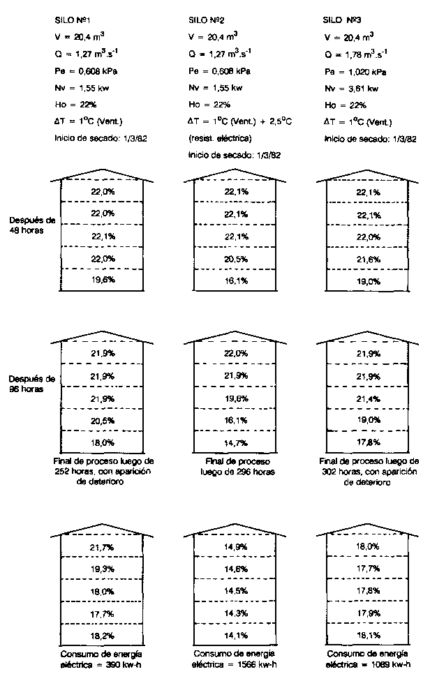 Analizando en conjunto los resultados de las Figuras 21 y 22, se observa que las condiciones climáticas son una de las variables de mayor importancia para el éxito del secado. En 1979, el secado del maíz con 22% se podia realizar con flujos del aire incluso inferiores a los que se utilizaron; en cambio en 1982 el secado con aire natural no fue posible y hubo que recurrir al uso de una fuente suplementaria de energía para calentar el aire. En reglones donde hay, ocasionalmente, años de elevada humedad relativa del aire durante el periodo de secado, conviene disponer de una fuente suplementaria de energía para usarla en dichos perlados.