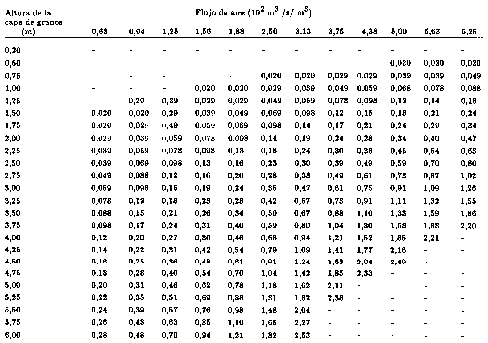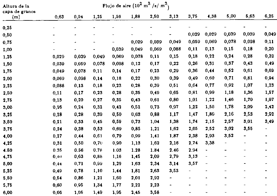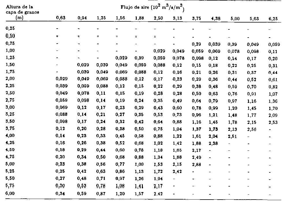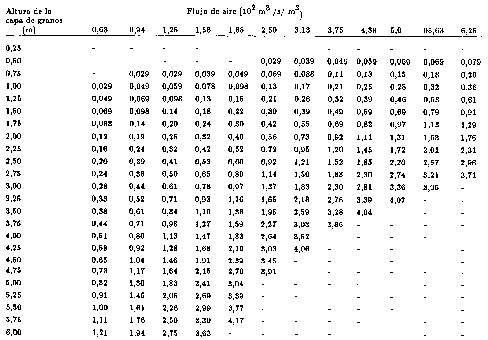 La presión estática, con un flujo de aire de 3,75·10-2 m3/s·m3y una capa de granos de 5 m de altura, según el Cuadro 18, es:
