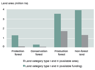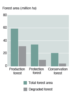 Between 1990 and 2000, Indonesia lost approximately 1.3 million hectares of its forest per annum (FAO, 2001). Indonesia’s Ministry of Forestry (2003a) estimated that 96.3 million hectares of the country’s land area was degraded, including 54.6 million hectares of degraded forest in need of rehabilitation (Figure 1).