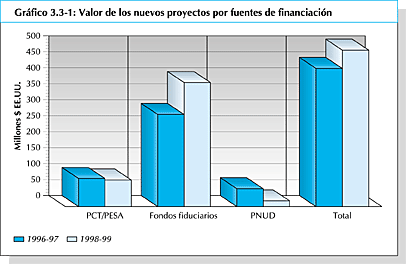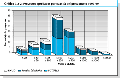 403. Alrededor del 65 por ciento de los proyectos aprobados y operacionales en 1998-99 tenían presupuestos inferiores a 250 000 dólares EE.UU., y más de la mitad de ellos variaban entre 100 000 y 250 000 dólares, como se muestra en el Gráfico 3.3-2. Continuó la disminución de proyectos grandes, ya que sólo el 5 por ciento de los proyectos aprobados tenían presupuestos superiores a 1 millón de dólares, frente a un 10 por ciento en 1996-97 y a más del 25 por ciento en el pasado. El PCT y el PESA representaron el 46 por ciento de los nuevos proyectos aprobados, seguidos por los Fondos Fiduciarios, con el 44 por ciento, y el PNUD con el 10 por ciento. En cuanto al PNUD, se registró un descenso del 15 por ciento en 1996-97. En el bienio 1998-99 fue la primera vez en que el número de los nuevos proyectos del PCT y PESA fue superior al de nuevos proyectos de Fondos Fiduciarios.