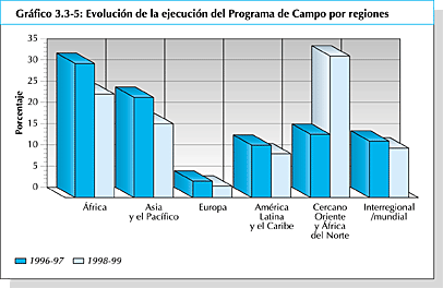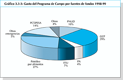 404. La ejecución del Programa de Campo en 1998-99 aumentó un 12 por ciento, ascendiendo a 555,2 millones de dólares EE.UU. (Cuadro 3.3-1). Como se ha señalado ya, esto se debió al incremento de las operaciones de emergencia y operaciones especiales de socorro, principalmente el Programa de Petróleo por Alimentos de Iraq cuyo valor se quintuplicó con creces, pasando de 28,1 millones de dólares EE.UU. en 1996-97 a 147,8 millones en 1998-99. Otras operaciones especiales de socorro aumentaron un 21 por ciento. En la mayoría de los demás sectores del Programa de Campo disminuyeron los gastos: PNUD en un 38 por ciento, Programa de Cooperación FAO/Gobiernos en un 9 por ciento, Programa de Profesionales Asociados en un 26 por ciento, Fondos Fiduciarios Unilaterales en un 13 por ciento y PCT y PESA en un 5 por ciento.