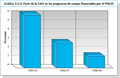 412. En cuanto a la distribución de la ejecución de proyectos en los países menos adelantados por fuentes de financiación, los fondos fiduciarios representaron el 49 por ciento en 1998-99, frente al 42 por ciento en 1996-97 (Cuadro 3.3-4). La principal reducción se registró en lo que respecta al PNUD, que en 1996-97 había representado el 36 por ciento de la ejecución de proyectos en los países menos adelantados y, en 1998-99, el 30 por ciento.