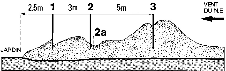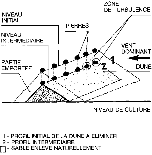 Des pierres de 20 à 30 cm de diamètre sont déposées le long de la crête des dunes à faire disparaître, et séparées les unes des autres par une distance pouvant varier, selon l'éloignement du lieu d'approvisionnement, de 0,50 à 1 mètre. Lorsque le vent érosif souffle, des turbulences se créent au niveau de chaque pierre. Ces turbulences augmentent ponctuellement la vitesse du vent et son énergie cinétique, lui permettant de transporter plus loin le sable remis en mouvement. Un affouillement éolien se produit à la base de chaque pierre qui tend ainsi à descendre. D'autre part, entre deux pierres, il se crée un effet de "sifflet" se traduisant encore par une accélération de la vitesse du vent et de son énergie cinétique. Sous l'effet de ces deux actions, les petites dunes, qui s'érodent dans leur partie supérieure, diminuent progressivement jusqu'à disparaître complètement (voir figure 22 a).