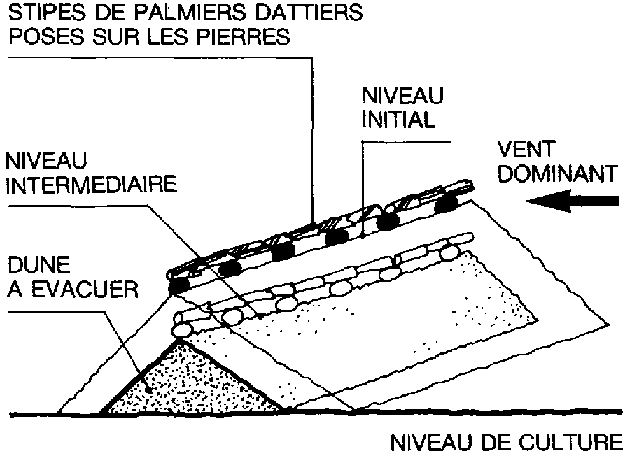 Pour les grosses dunes les paysans utilisent la même technique que pour les petites, mais l'accélération provoquée du vent est encore accrue par l'adjonction de stipes de palmiers-dattiers posés horizontalement sur les alignements de pierres. Le vent, passant dans les espaces compris entre celle-ci, le sommet de la dunes et les stipes, augmente de vitesse en les traversant et se charge de sable. Pierres et stipes descendent simultanément au fur et à mesure que la crête de la dune s'érode (voir figures 22 b et 22 c).