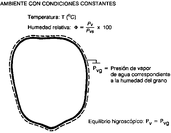 La presión parcial del vapor de agua que existe en el micro ambiente (capa de aire limite) en contacto con el grano es Pvg. Cuando el grano está en equilibrio higroscópico con el aire que lo envuelve, hay intercambio recíproco de humedad (agua) entre el aire y el grano, porque no hay diferencia de presión parcial de vapor entre la humedad de la superficie del grano y la del aire. Se tiene, por tanto: