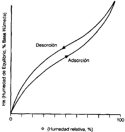El contenido de humedad de equilibrio de un material higroscópico, en determinadas condiciones de temperatura y humedad relativa de equilibrio, depende del camino que se siga para alcanzar el equilibrio. Así, para una misma humedad relativa, puede haber dos isotermas, denominadas isotermas de adsorción y de deserción, obtenías en función de las condiciones experimentales iniciales. Esto, porque el material puede presentar un contengo de humedad menor o mayor que la humedad de equilibrio para las condiciones del ambiente. Este fenómeno se llama histéresis. Las isotermas tienen forma sigmoidal, pues la isoterma de deserción presenta valores de humedad de equilibrio superiores al de la isoterma de adsorción (Figura 11).