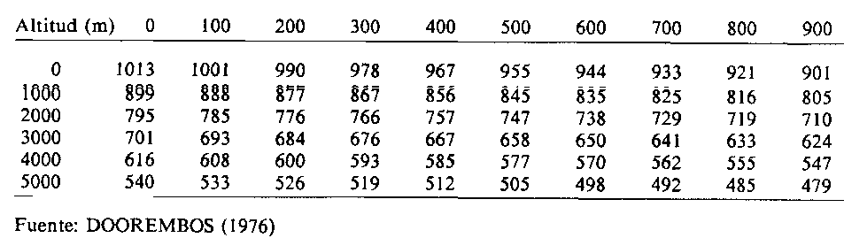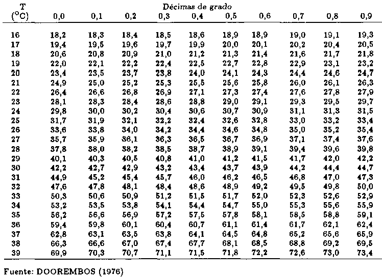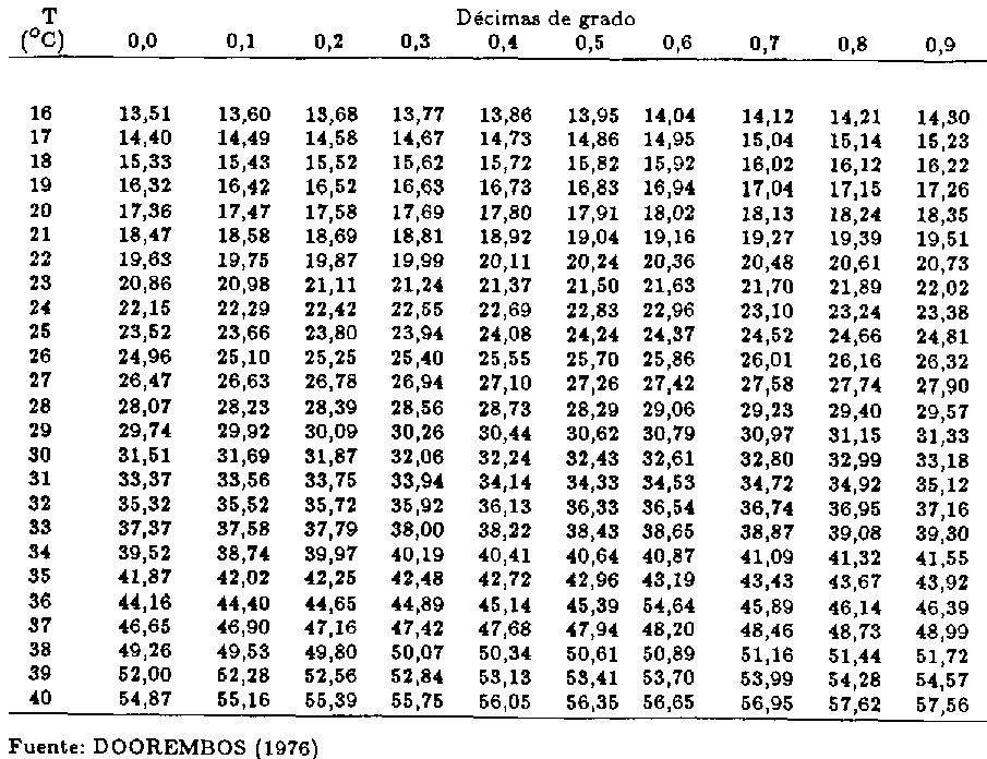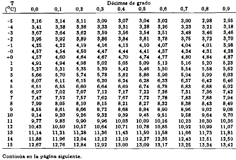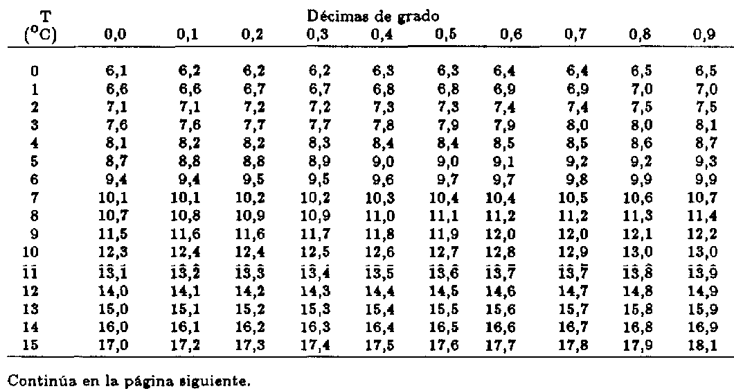 vapor de agua saturado (mbar), para presido atmosférica de 1013