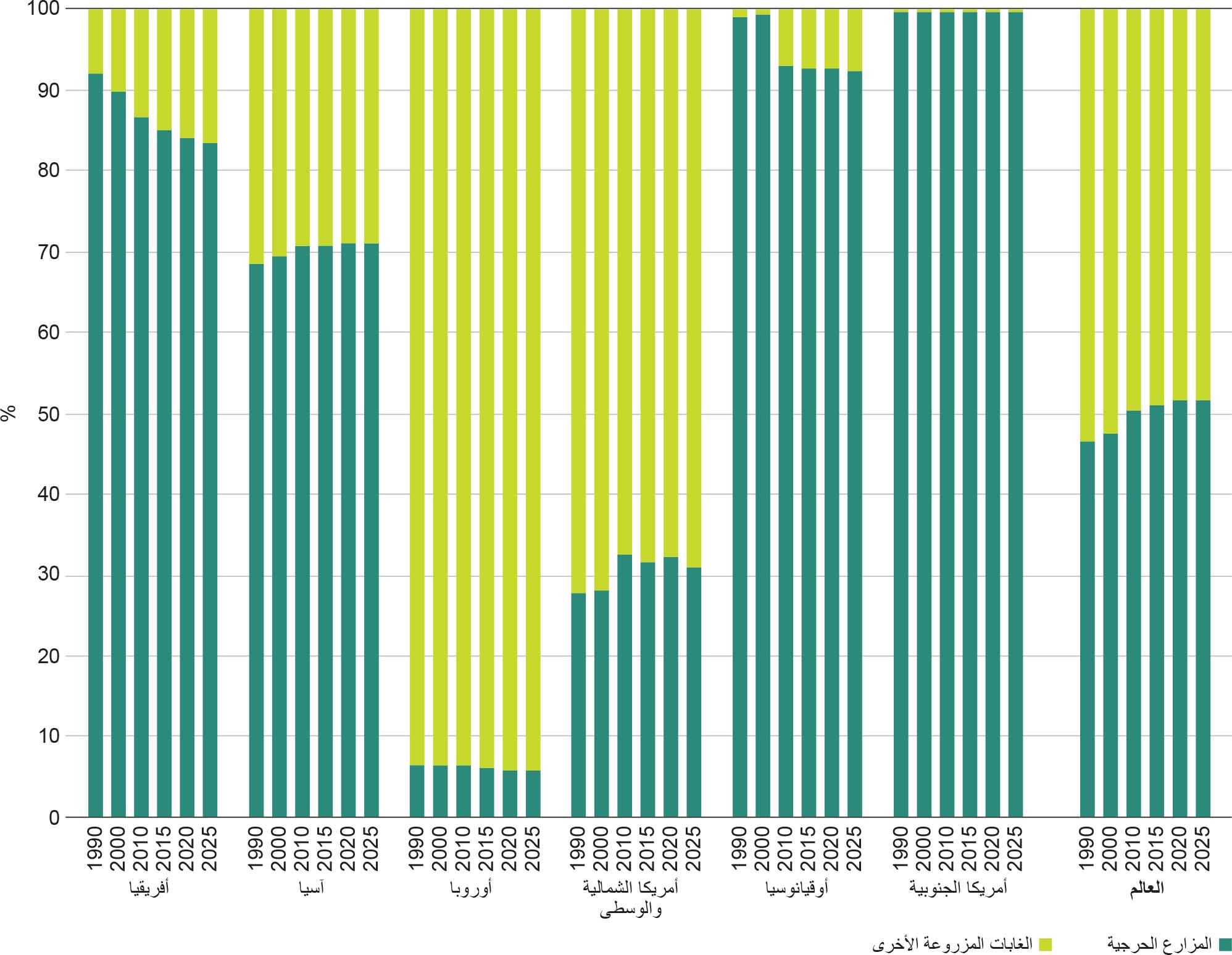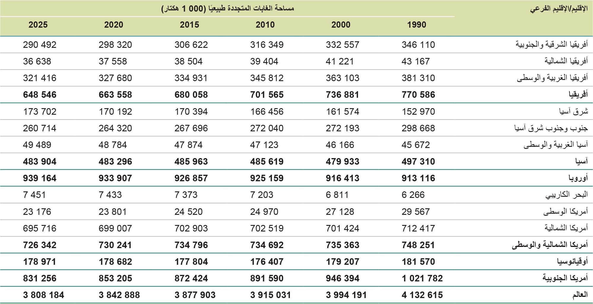 وكان هناك انخفاض صافٍ في مساحة الغابات البكر في جميع المناطق باستثناء أوروبا منذ عام 1990. وكان معدل الخسارة الصافية السنوية في أفريقيا وأمريكا الشمالية والوسطى وأمريكا الجنوبية أقل في الفترة 2015-2025 مما كان عليه في الفترتين الأخريين اللتين شملهما التحليل (أي الفترة 1990-2000 والفترة 2000-2015)؛ وسُجِّل أعلى مستوى في الفترة 2000-2015. وحصلت زيادة صافية في مساحة الغابات البكر في آسيا خلال العقد الأخير بعدما انخفضت في الفترتين الأخريين اللتين شملهما التحليل.