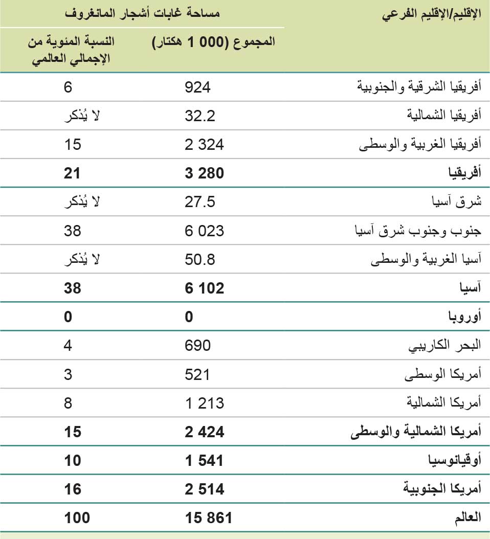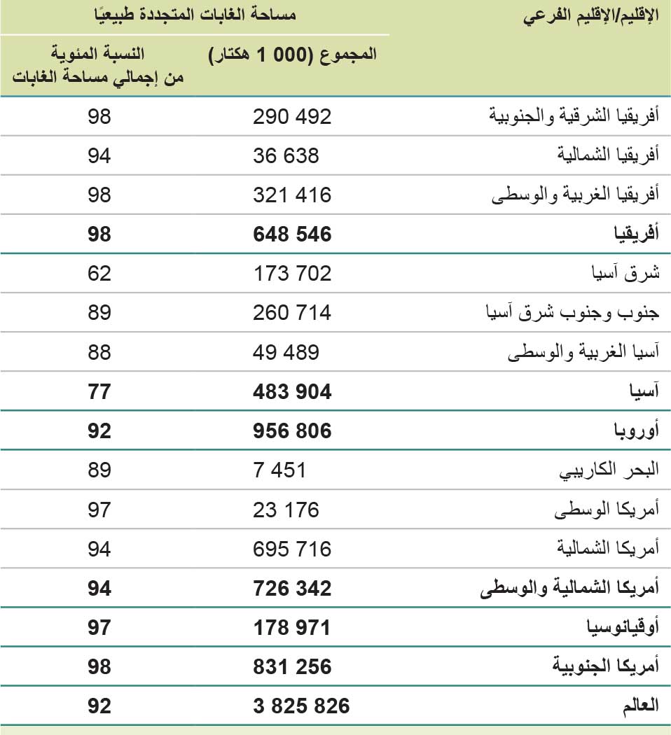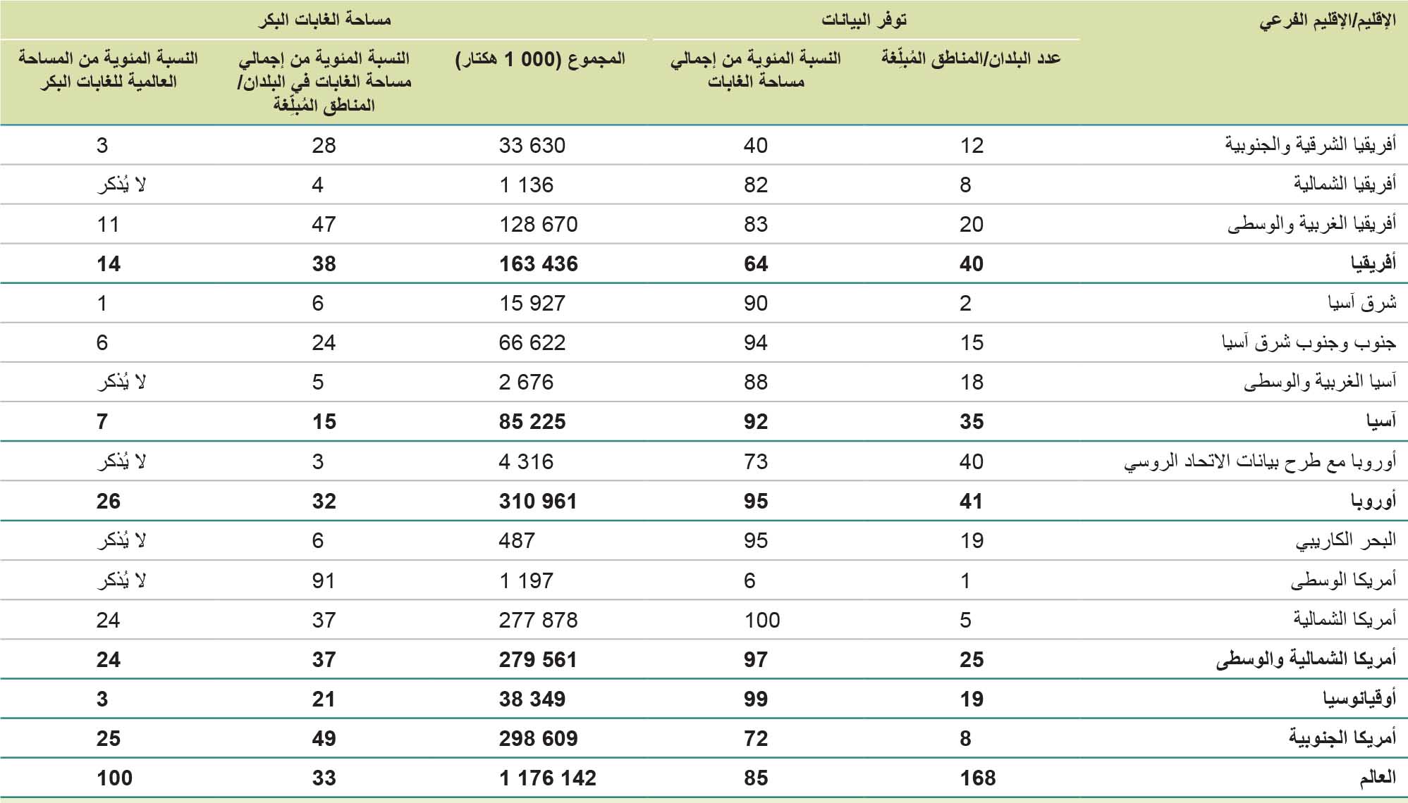 وتملك أوروبا، من بين سائر الأقاليم، أكبر مساحة من الغابات البكر، إذ تبلغ 311 مليون هكتار (مع أن أوروبا لا تملك سوى 4.32 مليون هكتار، وذلك عند طرح البيانات الخاصة بالاتحاد الروسي)، تليها أمريكا الجنوبية (299 مليون هكتار) وأمريكا الشمالية والوسطى (280 مليون هكتار). وتملك أفريقيا ما يُقدَّر بنحو 163 مليون هكتار من الغابات البكر، وآسيا 85.2 مليون هكتار، وأوقيانوسيا 38.3 مليون هكتار. وتمثل الغابات البكر 49 في المائة من إجمالي مساحة الغابات في أمريكا الجنوبية، و38 في المائة في أفريقيا، و37 في المائة في أمريكا الشمالية والوسطى، و32 في المائة في أوروبا، و21 في المائة في أوقيانوسيا. وتملك آسيا أدنى نسبة من الغابات البكر، إذ تبلغ 15 في المائة من إجمالي المساحة الحرجية فيها. وإذا ما طُرحت بيانات الاتحاد الروسي، تكون لدى أوروبا أقل حصة من الغابات البكر بين سائر المناطق، بنسبة 3 في المائة من إجمالي مساحة الغابات. ويبيّن الجدول 19 البلدان والمناطق الخمس الرئيسية من حيث الغابات البكر كنسبة من إجمالي مساحة الغابات: أفادت أربعة من هذه البلدان والمناطق عن نسب تزيد عن 90 في المائة، بما في ذلك الملديف، حيث أُفيد عن 100 في المائة من مساحة الغابات باعتبارها غابات بكر، ويرجع ذلك بشكل أساسي إلى أن جميع الغابات في البلاد تقع في جزر غير مأهولة. وتمثل خمسة بلدان - بالترتيب التنازلي بحسب مساحة الغابات البكر، الاتحاد الروسي والبرازيل وكندا وجمهورية الكونغو الديمقراطية وإندونيسيا - 75 في المائة من مساحة الغابات البكر في العالم (الجدول 20).